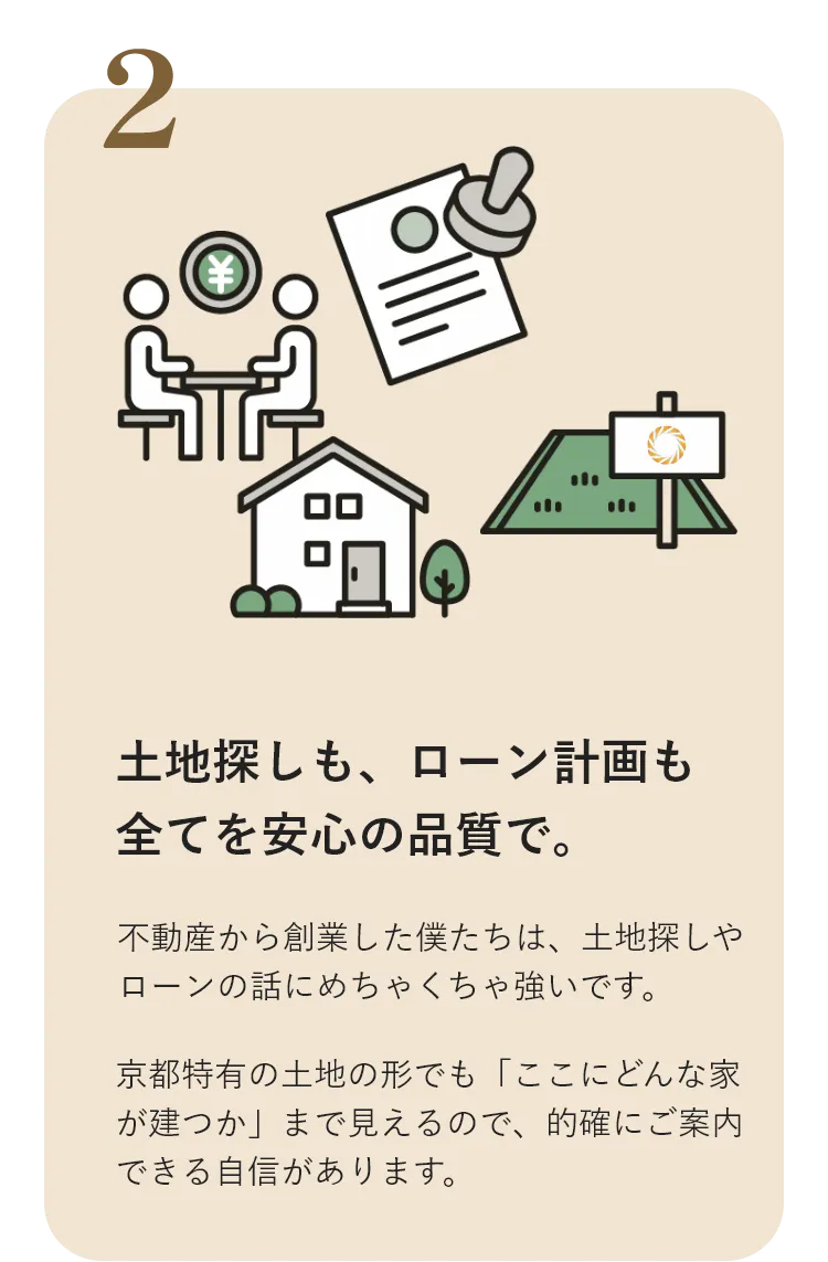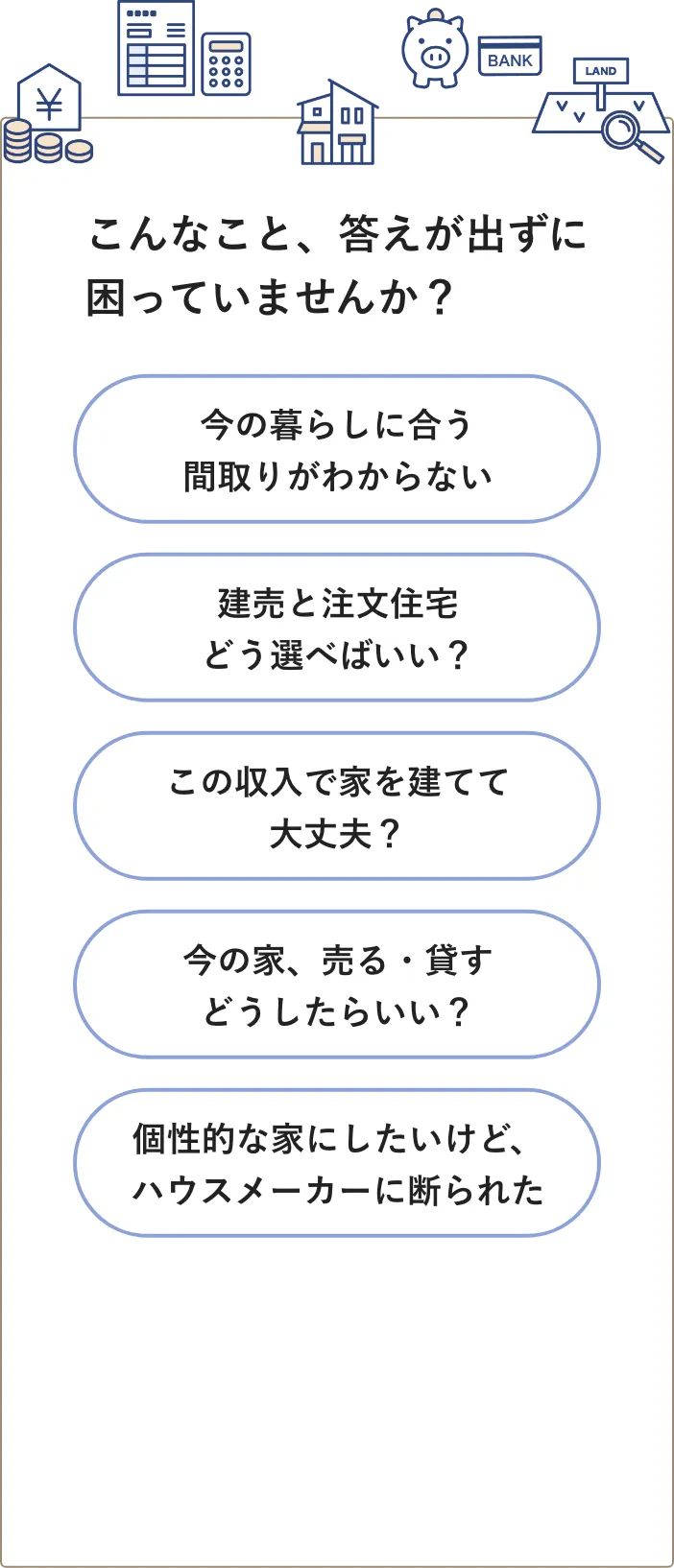 土地や建物、資金のお話など、お悩みに合わせて具体的なお話をします。