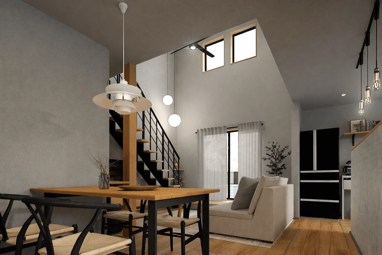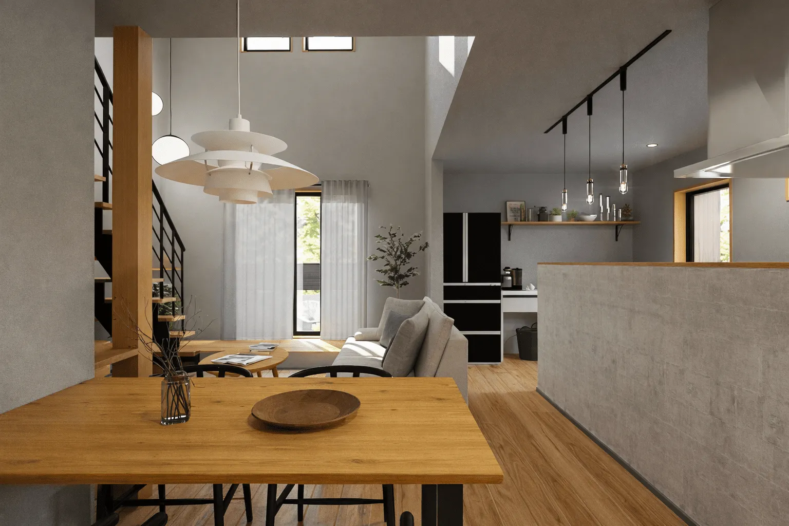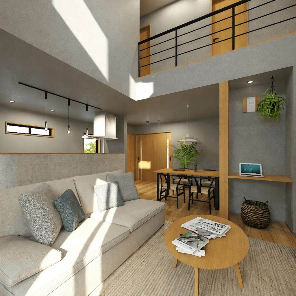 リビング部分は吹き抜けとし開放感を出し、ダイニング&キッチンは落ち着いた空間に。