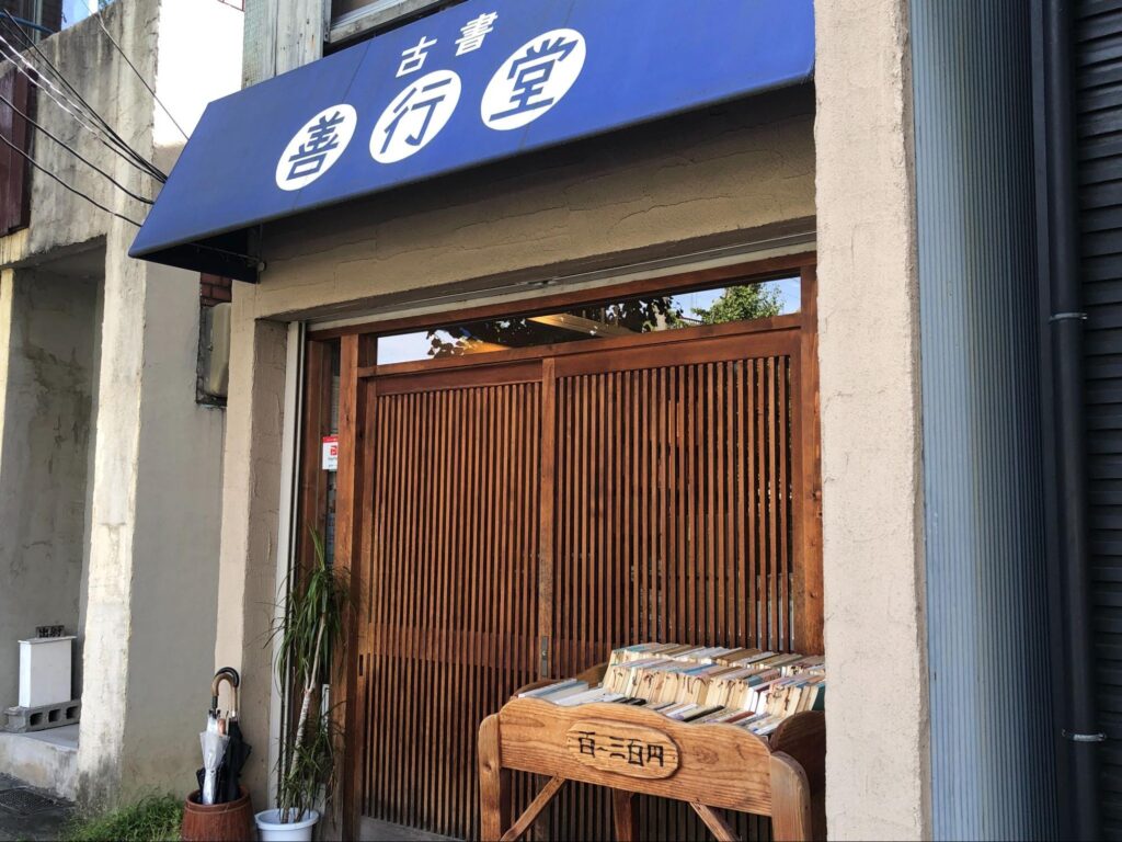 今出川通りに面した『古書善行堂』は、青いひさしと木の引き戸が印象的な古書店。