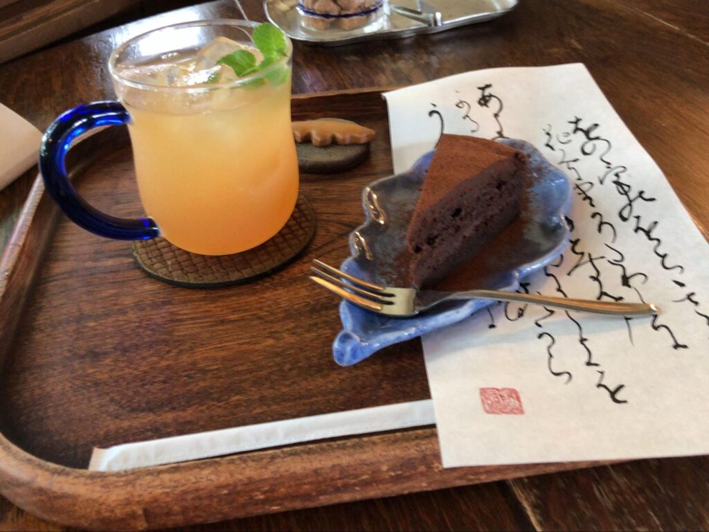建物は、本館や門と合わせて国の登録有形文化財に登録されています。窓からは大文字山も見え、緑豊かな周囲の景色にホッとくつろげるカフェ。美しい字で綴られた和歌とともに提供されるメニューにもうっとり。