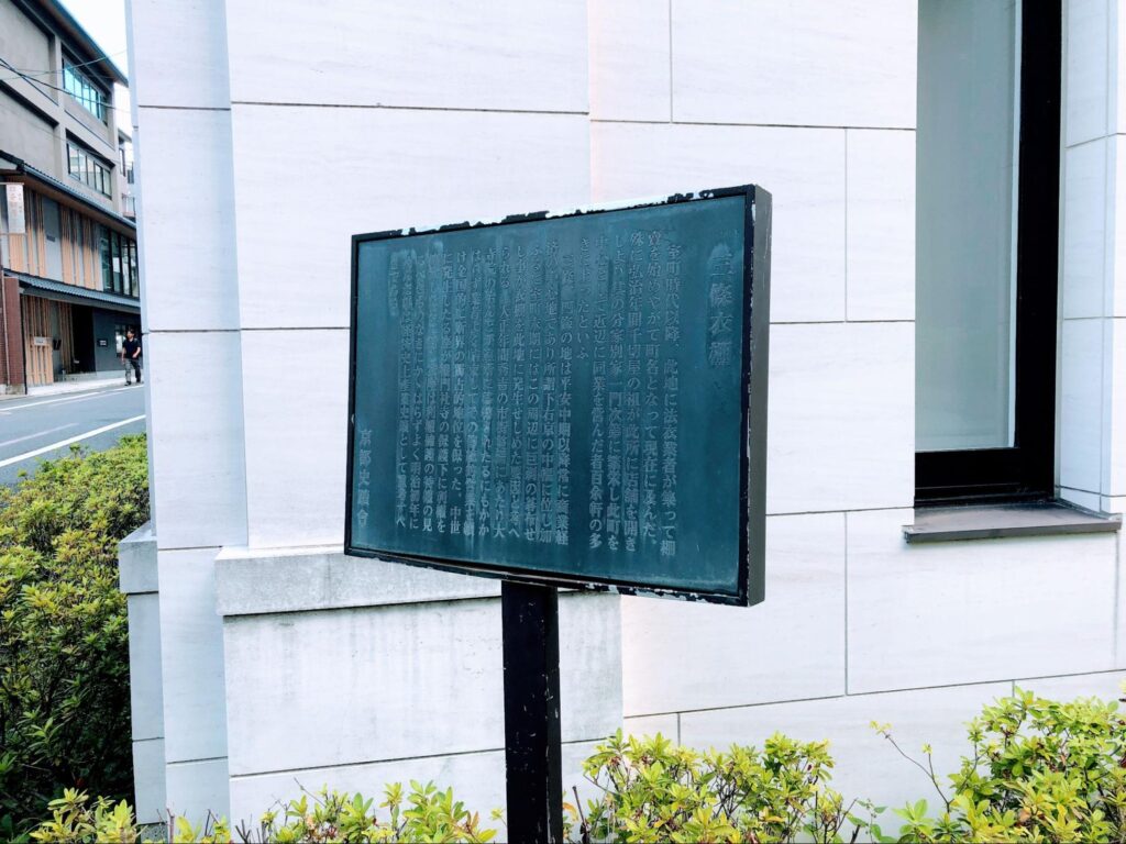 衣棚通(ころものたなどおり)は、烏丸通の西側にある南北の道です。衣棚通と三条通が交わるところには、「三条衣棚の歴史」という説明板が立っています。