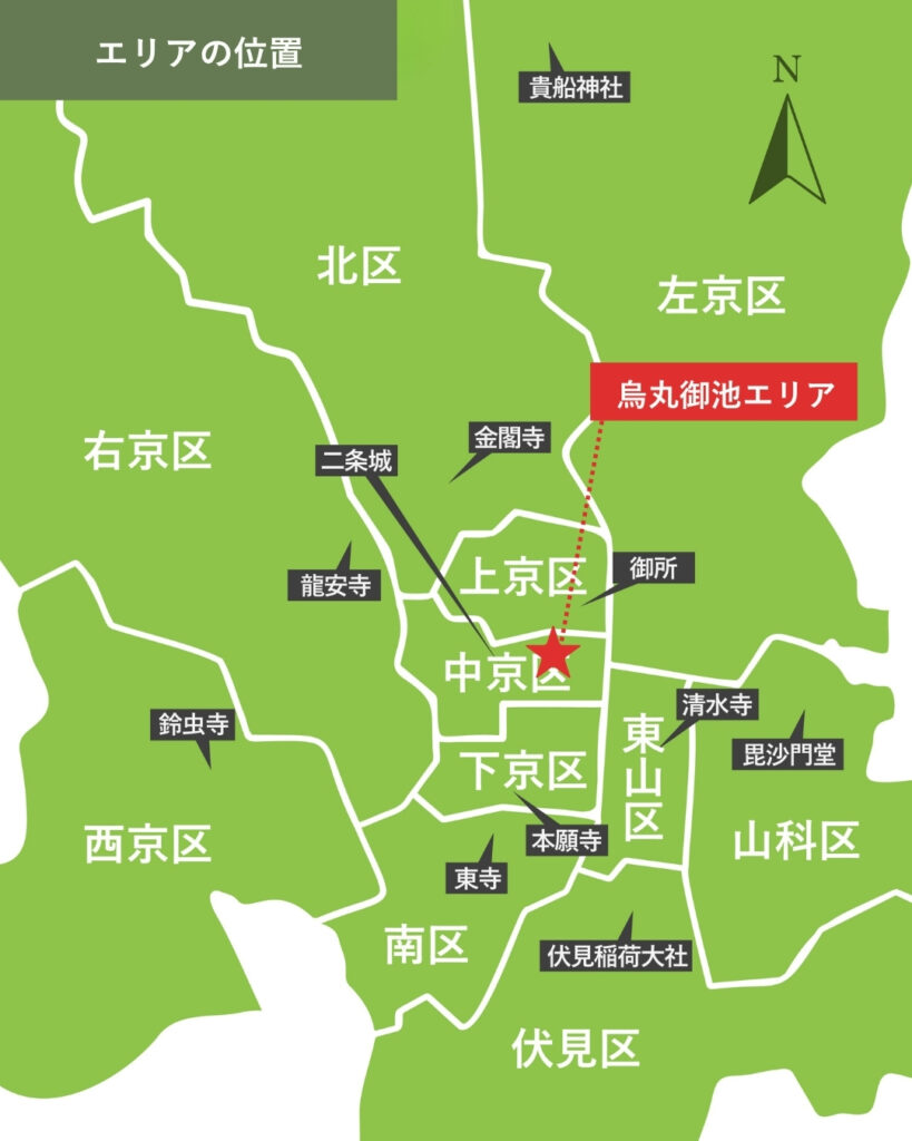 京都市営地下鉄の烏丸御池駅を中心とした烏丸御池エリアは、中京区に位置し、京都市のほぼ中央にあります。